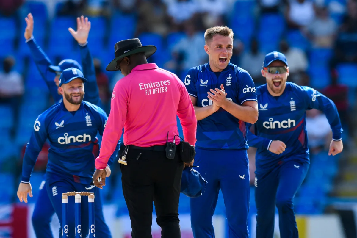 অ্যান্টিগায় টসে হেরে আগে ব্যাট করা ওয়েস্ট ইন্ডিজ মাত্র ৩৯.৪ ওভার খেলে সবকটি উইকেট হারিয়ে ২০২ রান করে। ইংল্যান্ড পেসারদের দাপটে মাত্র ২৩ রানেই ৪ উইকেট হারায় শাই হোপের দল। সেই বিপর্যয় সামাল দিয়ে অধিনায়ক হোপ শেরফান রাদারফোর্ডকে নিয়ে ১২৯ রানের জুটি গড়েন। তবে এই জুটি ভাঙার পর ধসে পড়ে ওয়েস্ট ইন্ডিজের ব্যাটিং লাইনআপ। শেষ ৫০ রানেই ৬ উইকেট হারায় তারা। শাই হোপ ৬৮ বলে ৬৮ এবং শেরফান রাদারফোর্ড ৮০ বলে ৬৩ রান করেন। বিশ্বকাপে ব্যর্থ ২৫ বছর বয়সী স্যাম কারেনের ঘূর্ণি জাদুতে গুড়িয়ে যায় ওয়েস্ট-ইন্ডিজের ব্যাটিং লাইন আপ। ৩ উইকেট নিয়েছেন কারেন ও লিভিংস্টোন, রেহান ও আটকিন্সন নিয়েছেন দুটি করে উইকেট।