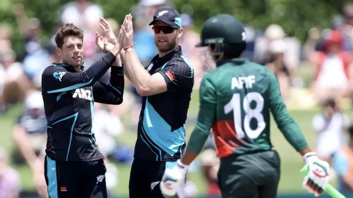 নিউ জিল্যান্ড: ১৪.৪ ওভারে ৯৫/৫ (অ্যালেন ৩৮, সাইফার্ট ১, মিচেল ১, ফিলিপস ১, চ্যাপম্যান ১, নিশাম ২৮*, স্যান্টনার ১৮*; তানভির ১-০-১২-০, মেহেদি ৪-০-১৮-২, শরিফুল ৩.৪-০-১৭-২, মুস্তাফিজ ৩-০-১৩-০, রিশাদ ২-০-১৯-০, শান্ত ১-০-১৪-০)