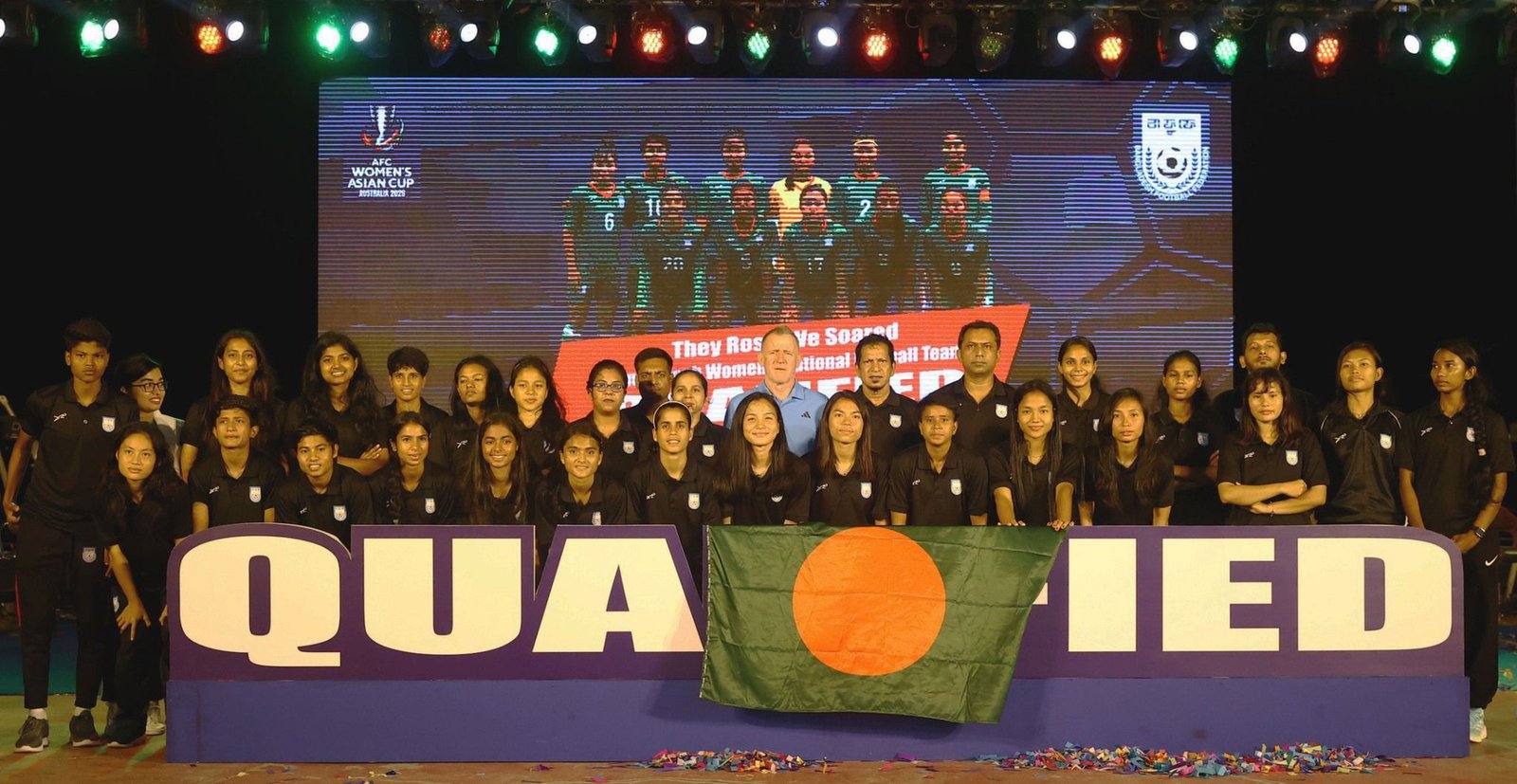 রাত তিনটার একটু পর আলো ঝলমলে মঞ্চে আসেন হাস্যোজ্জ্বল বাংলার দামাল মেয়েরা। তাদেরকে ফুল দিয়ে বরণ করে নেন বাফুফের কর্মকর্তাবৃন্দ।