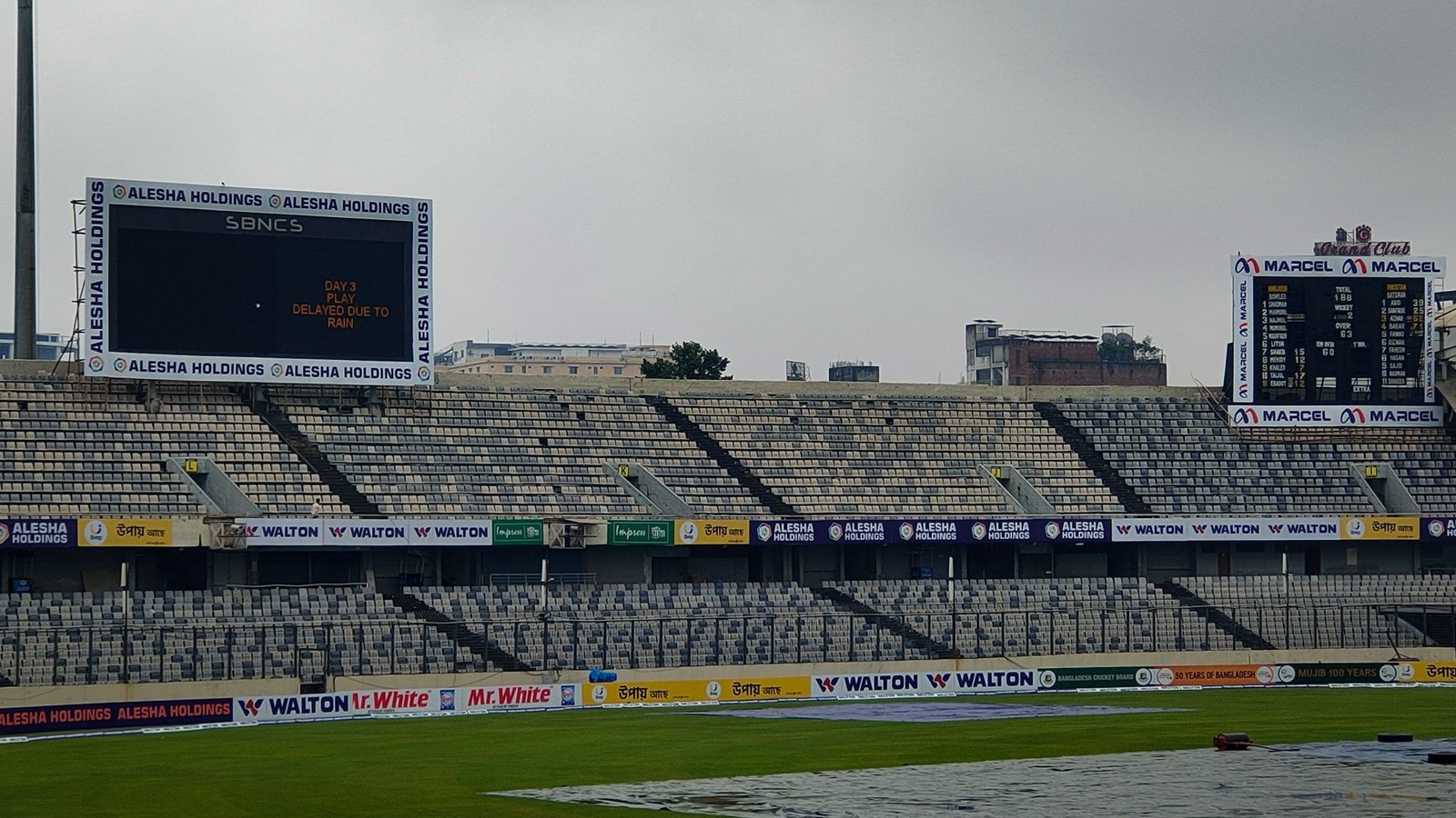নির্দিষ্ট সময়ে খেলা শুরু হওয়ার সম্ভবনা না থাকায় এখন পর্যন্ত মাঠেই আসেনি দুই দল। প্রকৃতির বিরূপ অবস্থা দেখে সবাইকে হোটেলেই থাকার পরামর্শ দিয়েছেন ম্যাচ রেফারি নিয়ামুর রশিদ। সবশেষ দুপুর ১২টায় মাঠের পরিস্থিতি পর্যবেক্ষণ করেন মাঠের আম্পায়াররা। এখন পযর্ন্ত বৃষ্টি থামার কোন লক্ষণ না দেখায় তৃতীয় দিন মাঠে গড়ানোটা পুরাপুরি অনিশ্চিত বলা চলে। বৃষ্টি সম্পূর্ণ থামার পর কমপক্ষে এক ঘন্টা মাঠ ঢাকা থাকবে। এরপর কাভার উঠিয়ে মাঠ শুকানোর কাজ করা হবে।