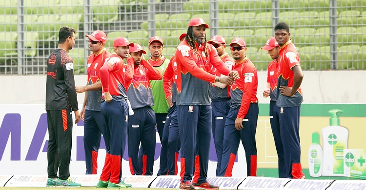 এর আগে টস হেরে ব্যাট করতে নামে ফরচুন বরিশাল। শুরু থেকেই খুলনার বোলারদের উপর চড়াও হন ওপেনিংয়ে নামা ক্রিস গেইল। আক্রমণাত্মক ব্যাটিংয়ে ফিফটির দিকে ছুঁটতে থাকা গেইলকে থামান সেকুগে প্রসান্না। ৬টি চার ও ২টি ছক্কার সাহায্যে ৩৪ বলে ৪৫ রান করেন ইউনিভার্স বস।