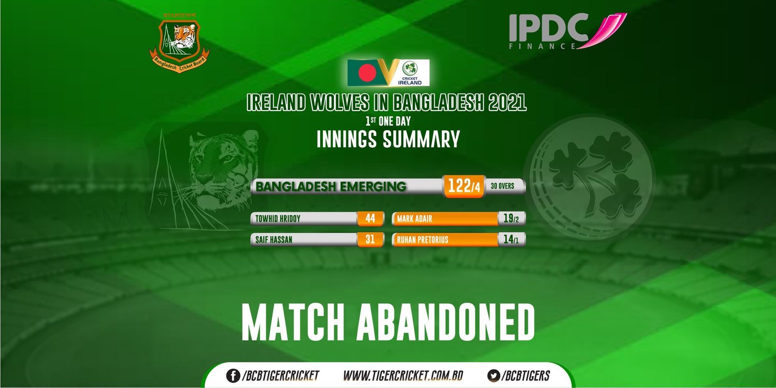চট্টগ্রামের জহুর আহমেদ চৌধুরী স্টেডিয়ামে ম্যাচের ৩০ ওভার খেলা হওয়ার পর জানা গেল, মাঠে নামা এক আইরিশ ক্রিকেটারের কোভিড-১৯ শনাক্ত হয়েছে। ফলে পরিত্যক্ত হয়ে গেল চট্টগ্রামে বাংলাদেশ ইমার্জিং দলের সঙ্গে আয়ারল্যান্ড উলভস এর প্রথম একদিনের ম্যাচ।