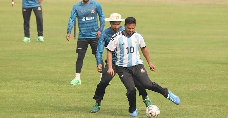 ভারতের বিপক্ষে দ্বিতীয় টেস্টকে সামনে রেখে মঙ্গলবার (২০ ডিসেম্বর) মিরপুর শেরে বাংলা জাতীয় স্টেডিয়ামে অনুশীলনে অধিনায়ক সাকিব হাজির হয়েছিলেন মেসির ১০ নম্বর জার্সি পরে। ওয়ার্ম-আপ ফুটবল ম্যাচে গোলও করেছেন তিনি।